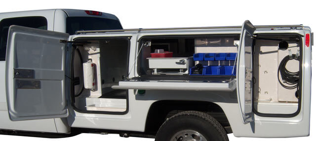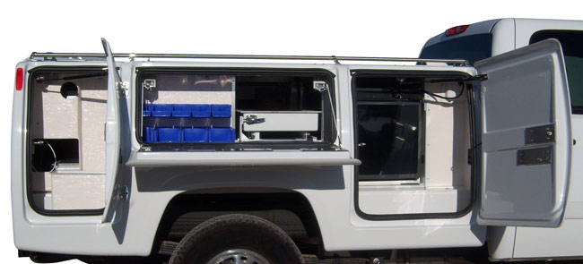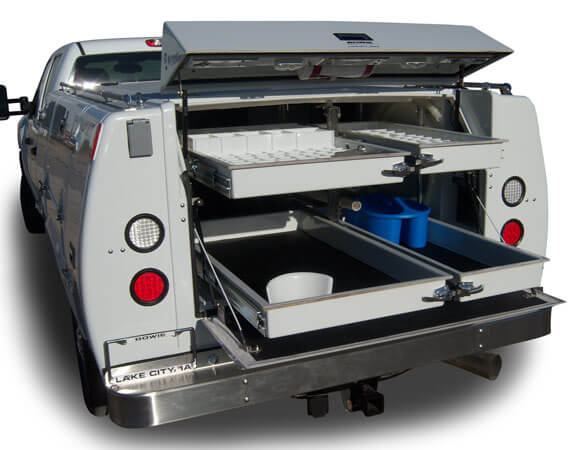 Additional Standard Features: Remote Keyless Entry with two multi-function key fobs. Large 18 gallon water tank with outside fill. Digital thermostat to regulate water temperature. 12V diaphragm water pump with front & rear discharge hose. Day Heater: hi-output w/ thermostat & circulating fan. Night Heater: w/ thermostat & circulating fan. Flush mounted doors & handles with automotive weather stripping & gas struts. Rear enclosed compartment with V-Door & bottom work surface door. Modular wiring. All stainless steel bolts and screws. Removable drawers. Automatic LED interior lights with manual override. Air vent. 22′ 110V night cord. Top rail. Stainless steel cold sterilization tray. 110V rechargeable field emergency light. Rear bumper.
