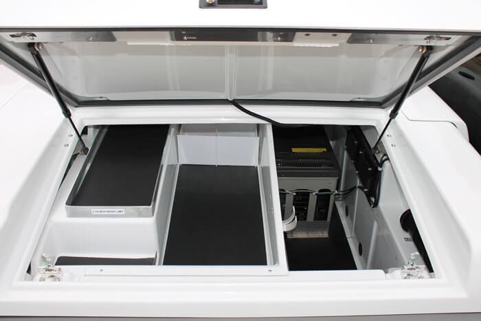 - Large flush mounted 43″ top doors and flush mounted rear doors with dual gas struts.