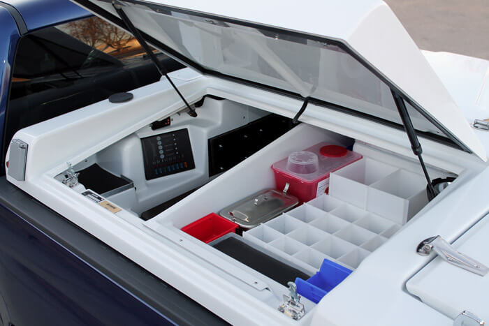 Left Top Compartment-Driver’s Side: Electronic Smart Panel with fused 12V DC system & indicator lights. Circuit Breaker protected 110V AC system. Injectable storage area with acrylic dividers. Cold sterilization tray. Sharps Container.