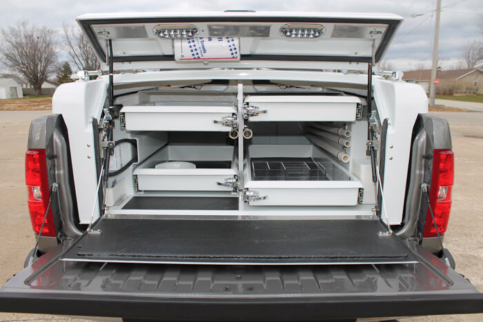 Additional Standard Features: Remote Keyless Entry with two multi-function key fobs. Large 18 gallon water tank with outside fill. Digital thermostat to regulate water temperature. 12V diaphragm water pump. Day Heater: hi-output w/ thermostat & circulating fan. Night Heater: w/ thermostat & circulating fan. Large flush mounted 43″ top doors and flush mounted rear door with dual gas struts. Automatic LED interior lights with manual override. HQ modular wiring system. All stainless steel bolts and screws. 3 point lift eyes. Air vent. 22′ 110v power cord. Automotive weather stripping. Flush mounted door handles with common key. Low profile design provides ample rear visibility. One removable 19″ x 25″ right upper drawer with dividers for 100cc injectables. Two removable 19″ x 33″ lower drawers. Large top storage tray with dividers. Rechargeable field emergency light. Quick disconnects for easy unit removal.